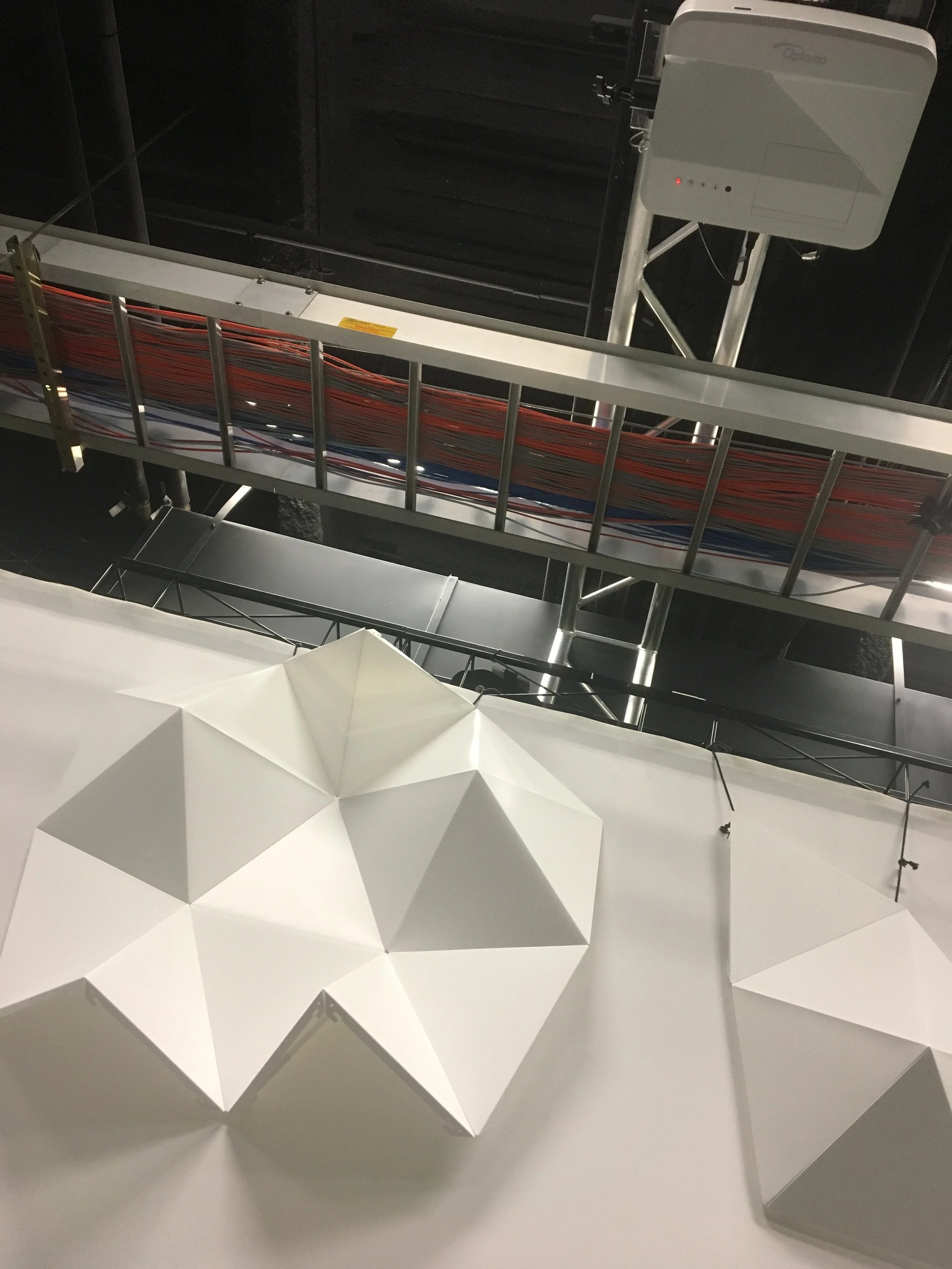 In an ideal environment, the projector should be mounted perpendicular with the projection surface to minimize distortion and projection overlap. Due to the constraints of the space, a short throw projector was mounted to the ceiling. This configuration created unavoidable geometry overlap on the top-left of the 3D objects, as well as reduced brightness on surfaces on a downward angle. To minimize the visual impact, I added shapes onto the backdrop in order to unite the shapes and to draw they eye away from areas the projector could not accurately cover.